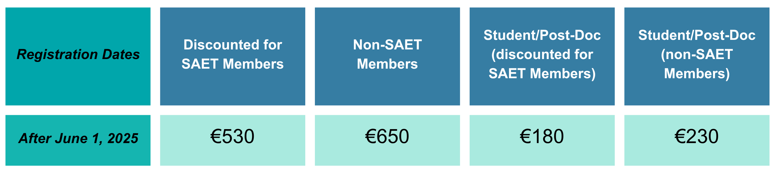 SAET Individual and Student/Post-Doc Members qualify for a discounted registration rate.